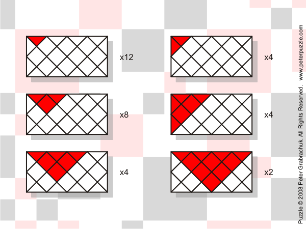 Triangles in the Embroidery - Solution There are 34 triangles in six different sizes in the pattern. The illustration below shows the triangles. ![]() |